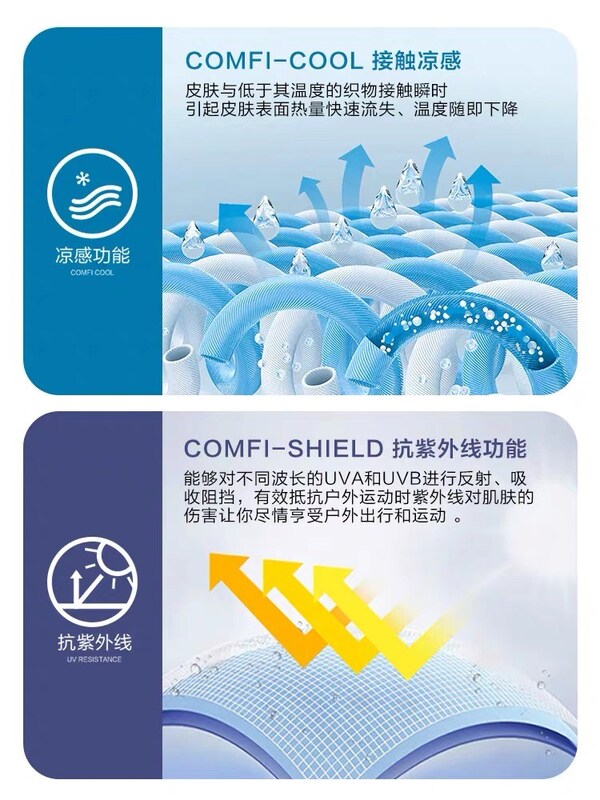 三款产品均采用COMFI-COOL凉科技,皮肤与低于其温度温度的织物接触瞬时快速流失热量,从而降低温度。即使面对暴晒场景,亦能提供凉爽触感,用亲肤舒适缓解运动燥热,轻松应对蒸腾暑气;COMFI-SHIELD抗紫外线功能更是可以提供高倍防晒,有效抵抗户外运动时的紫外线损伤,让你出汗也优雅,轻松斩获夏日「高智感」。