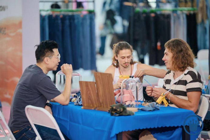 此外,特别引人注目的是“瓶中牛仔花”手工DIY环节。参与者们采用天丝牛仔与各色植物染牛仔面料动手制作属于自己的牛仔花,这些面料以其柔软的触感和丰富的色彩,激发了参与者无限的时尚灵感。每个人都沉浸在手工DIY的过程中,将自己的创意注入进每一朵独一无二的牛仔花里。