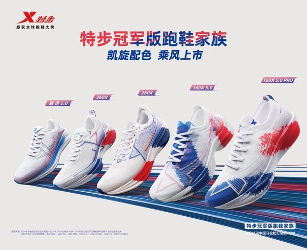 目前,特步冠军版跑鞋家族凯旋配色已推出五款不同功能的跑鞋,满足从竞速到日常训练的全方位需求,让精英跑者到初阶跑者都能拥有”定制版”凯旋配色冠军跑鞋。竞速旗舰碳板跑鞋160X 5.0 PRO,为破纪录而生;竞速碳板跑鞋160X 5.0,适合精英跑者马拉松比赛;多场景碳板跑鞋260X,赛训兼备;国民碳板跑鞋360X,适合大众跑者和入门跑者多场景使用,还有日常训练跑鞋騛速5.0,全矩阵让不同阶段的跑者都能感受专业冠军科技带来更稳、更快、更舒适的跑步体验。