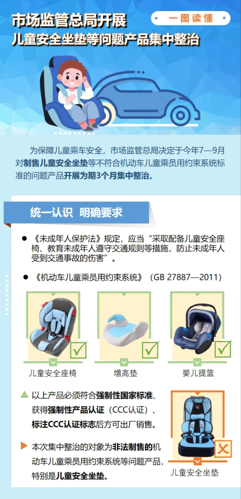 7月12日市场监管总局官方发布,决定于今年7— 9月对制售“儿童安全座垫”等不符合机动车儿童乘员用约束系统标准的问题产品开展为期3个月集中整治。目前在售的“儿童安全座垫”,根据其标称的产品结构、使用场所、安全性能等特点,均是非法制售的机动车儿童乘员用约束系统类产品。(央视新闻报道)