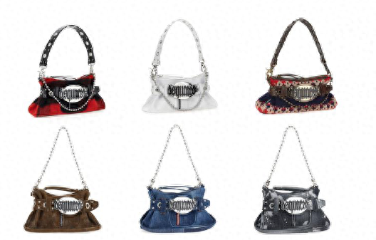 呼应于成衣系列的饼干色灯芯绒同样应用于本季哥特式腰带手提包中,配以孔眼肩带,呈现中号肩包和手拿包两种型号;马海毛和羊毛针织材质配以米色、蓝色和红色提花图案,配饰棕色皮革腰带和孔眼铆钉肩带;深蓝色牛仔款式以手绘白底营造雪景效果,与秀场成衣遥相呼应。