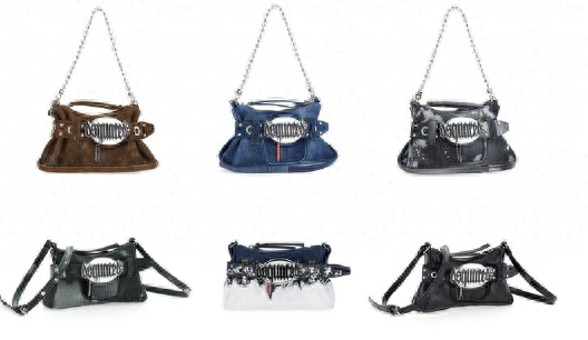 呼应于成衣系列的饼干色灯芯绒同样应用于本季哥特式腰带手提包中,配以孔眼肩带,呈现中号肩包和手拿包两种型号;马海毛和羊毛针织材质配以米色、蓝色和红色提花图案,配饰棕色皮革腰带和孔眼铆钉肩带;深蓝色牛仔款式以手绘白底营造雪景效果,与秀场成衣遥相呼应。