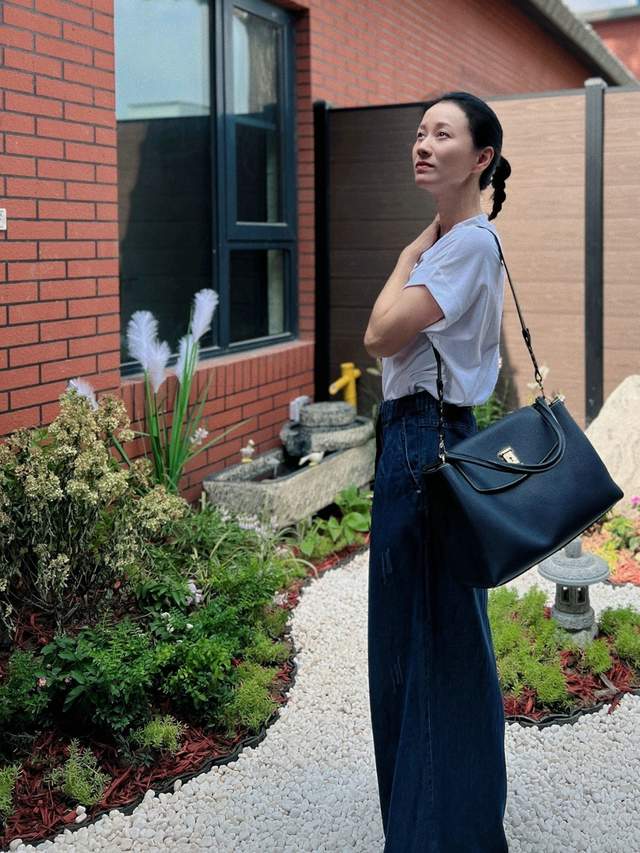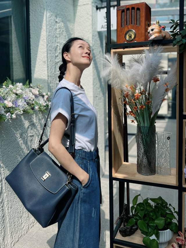 演员倪虹洁身背 Bally 春夏女士 Layka 雾霾蓝皮革手袋,质感皮革融合复古色彩,传递简约美感。