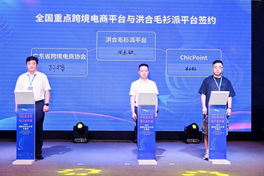 开幕式上,洪合“毛衫派”平台与广东省跨境电商协会、跨境电商平台chicpoint签署战略合作协议,共同推动跨境电商企业集聚、服务矩阵完善、生态体系优化,探索毛衫跨境电商新机遇。