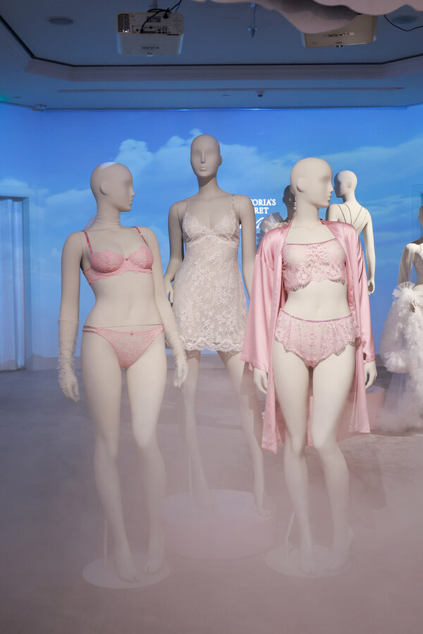 离开「梦幻大堂」,缓缓进入「梦幻密境」—— 古堡中的新品殿堂。整个空间采用柔和的蓝色背景和轻盈云朵吊饰,营造出简约舒适的产品陈列环境,诠释了维密全新梦幻系列柔软舒适的特点。该系列融合了经典的Dream Angels和Love Cloud的产品科技,结合了四面弹力柔软蕾丝和棉花糖记忆绵衬垫的产品优势,为女性打造比以往都更为精致梦幻的内衣设计和柔软舒适的穿着体验。在氤氲氛围之下,来宾仿佛置身于浪漫的蓝色密境之中,近距离地感受了新品的柔软触感,沉浸体验梦幻系列的独特魅力。