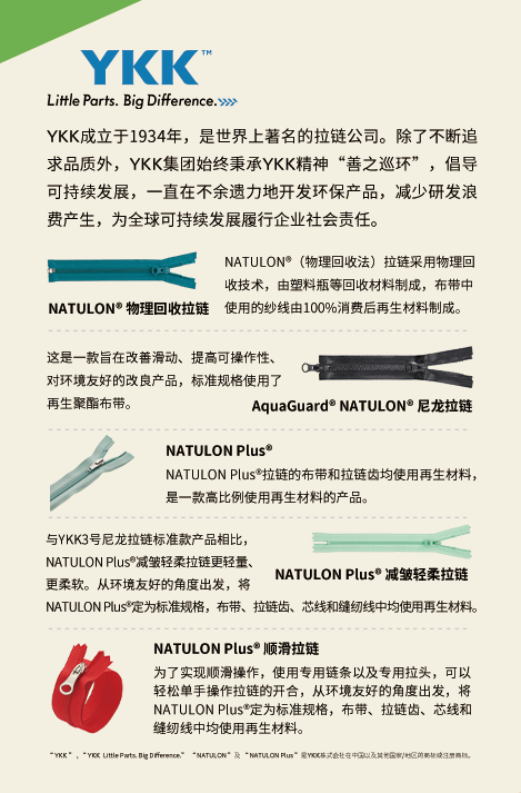 注: “YKK”,“YKK Littl Parts.Big Difference.”“NATULON”及“NATULON Plus”是YKK株式会社在中国以及其他国家/地区的商标或注册商标。