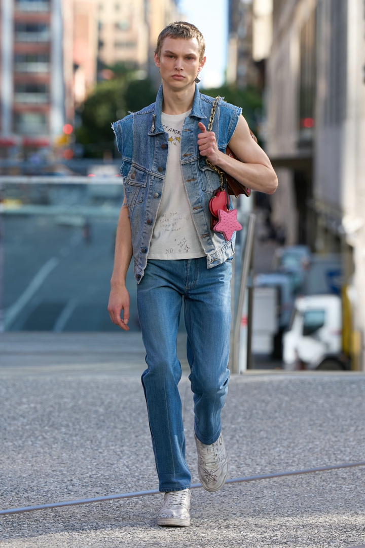 2025春季系列延续了对年轻一代眼中时尚的探索,将经典剪裁与高级定制的鸡尾酒裙元素融入反主流文化中。将标志性运动单品,如海军蓝外套、休闲裤和细条纹套装等,经过调整和夸张,设计成耳目一新的版型。而灵感来自60年代的糖果色连衣裙则采用了短下摆设计,灵动新颖。本次秀场的一大特色 —“re-loving”,让历经岁月沉淀的老旧产品重获新生。牛仔裤、Moto半裙和飞行员夹克经过艺术化的再利用制新而成,致敬品牌精湛工艺的同时呈现了原本的复古魅力。面对广受欢迎的Coach (Re)Loved,Vevers表示该项目是利用手工艺和定制技术进行修复和二次售卖。