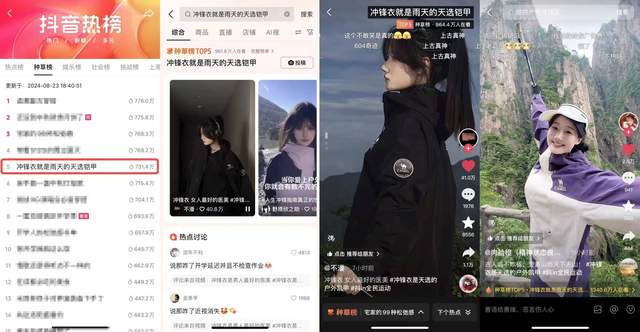 在抖音上,#冲锋衣太好看所以爱上了户外、#让人期待秋天的山系穿搭、#分享我的AI人生冲锋指南等关于冲锋衣的话题持续发酵,多个热点上榜。其中,#冲锋衣太好看所以爱上了户外 话题登上种草榜TOP 1,话题曝光超过2亿,引发用户主动搜索超800万次,让冲锋衣成为这个时节最具焦点的品类。