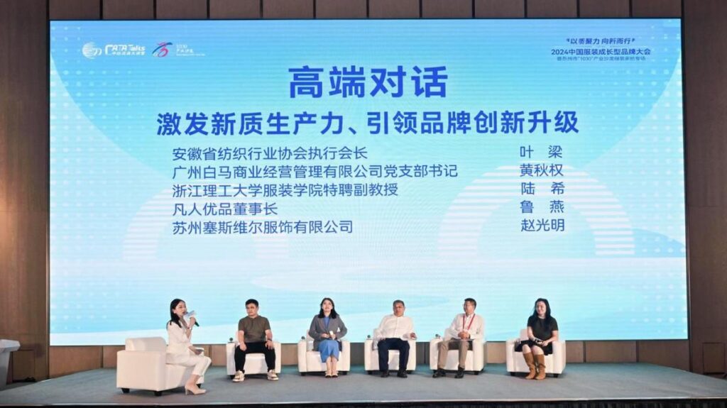 高质量发展是新时代的硬道理,也是中国服装成长型品牌的永久话题。安徽省纺织行业协会执行会长叶梁,广州白马商业经营管理有限公司党支部书记黄秋权,凡人优品董事长鲁燕,浙江理工大学服装学院特聘副教授、硕导陆希以及苏州塞斯维尔服饰有限公司总经理赵光明从各自角度开启了“激发新质生产力,引领品牌创新升级”的主题对话。