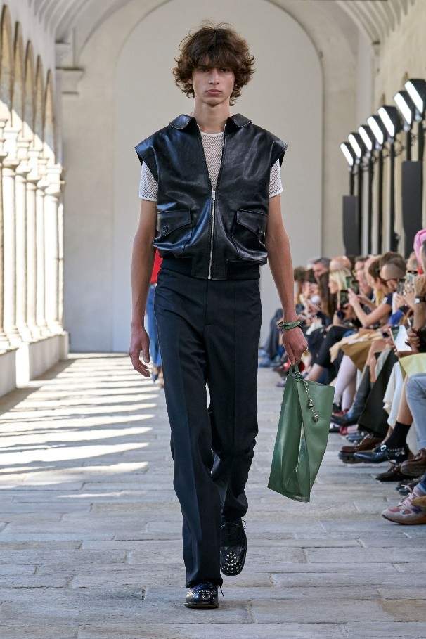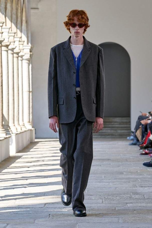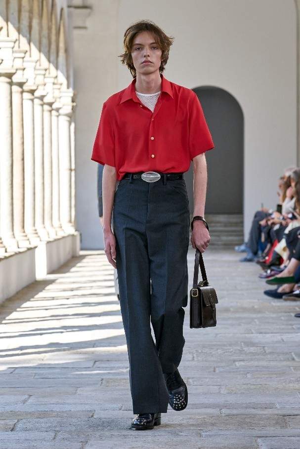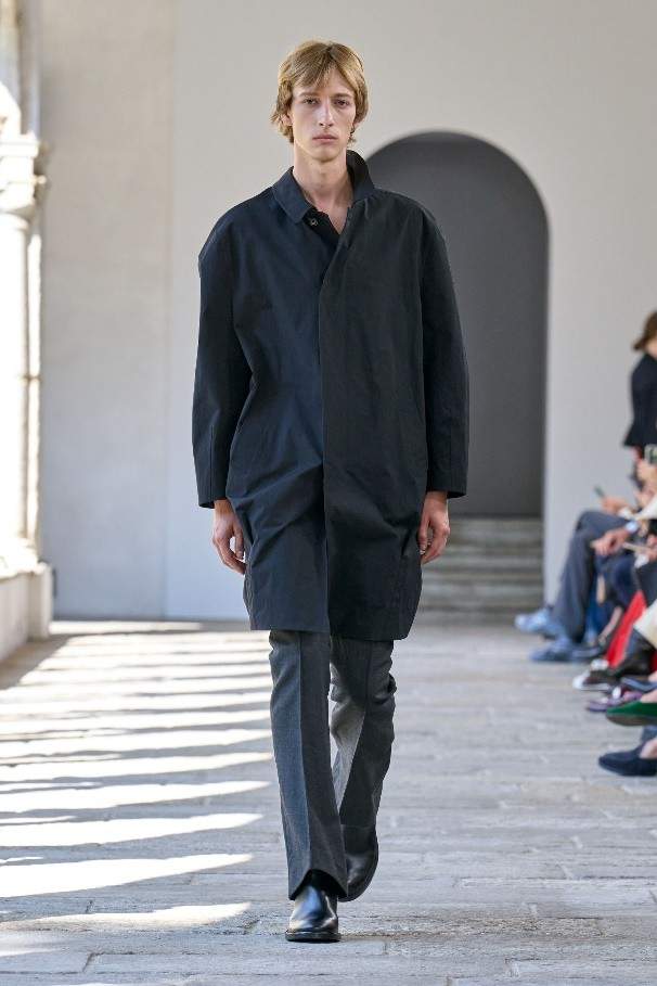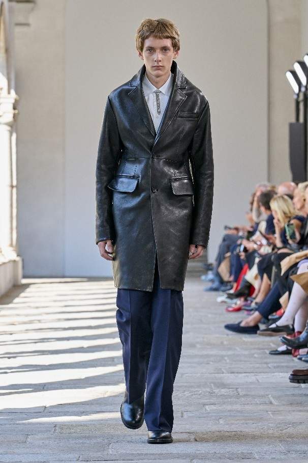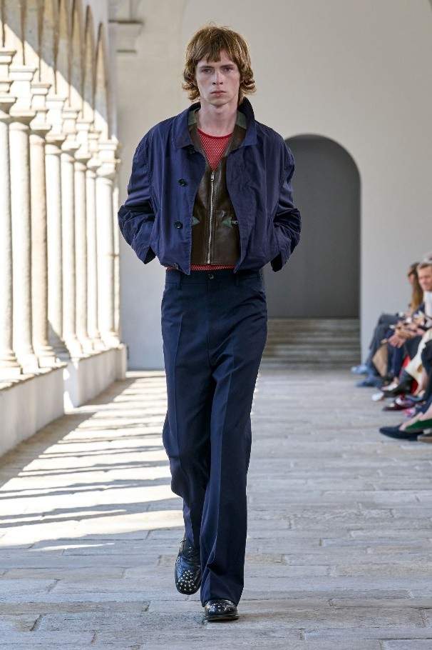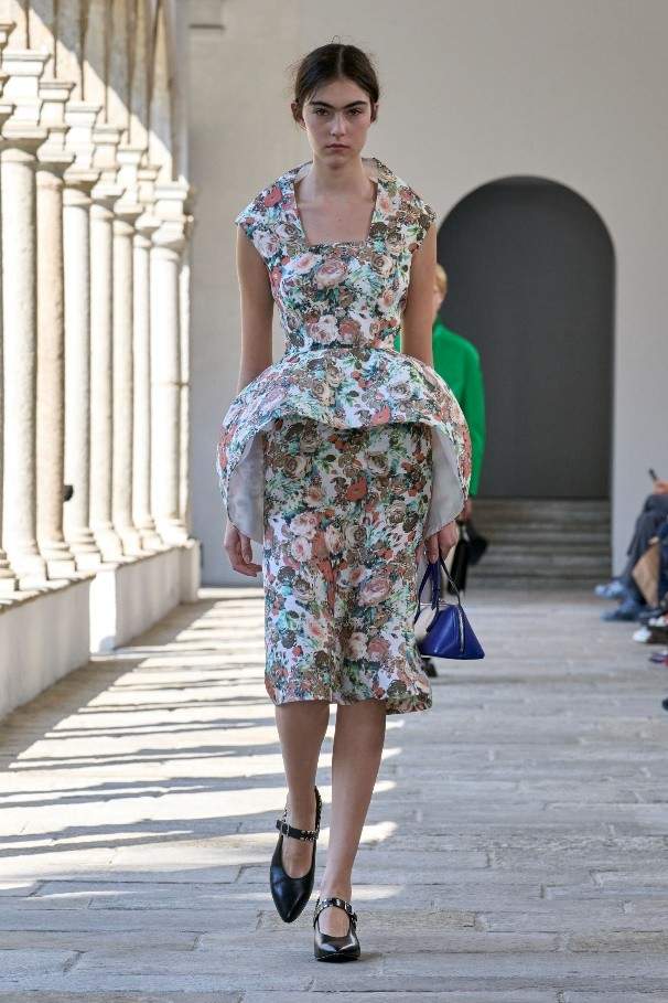 诗人雨果·鲍尔 (Hugo Ball) 曾身着茧形凹面钢制长袍,为低领廓形添以歌剧风格。本季以其荒诞叛逆的姿态为灵感,随处点缀花瓣般的荷叶褶边、圆润衣袖以及褶皱垂坠塔夫绸或透明真丝。雕塑般的立体剪裁运用夏季斜纹面料与上乘 Bally 皮革,或勾勒腰身,或垂至膝盖,呈现利落简洁的线条。亮色高科技外套结合保护性能与舒适精裁,褶叠钟形裙与薄纱连衣裙形似春日的山间花卉,羊绒针织衫与瓦托背上衣印饰褪色玫瑰印花。各款新作以达达主义质询着装准则,运用层叠效果,巧妙重塑经典原型。
