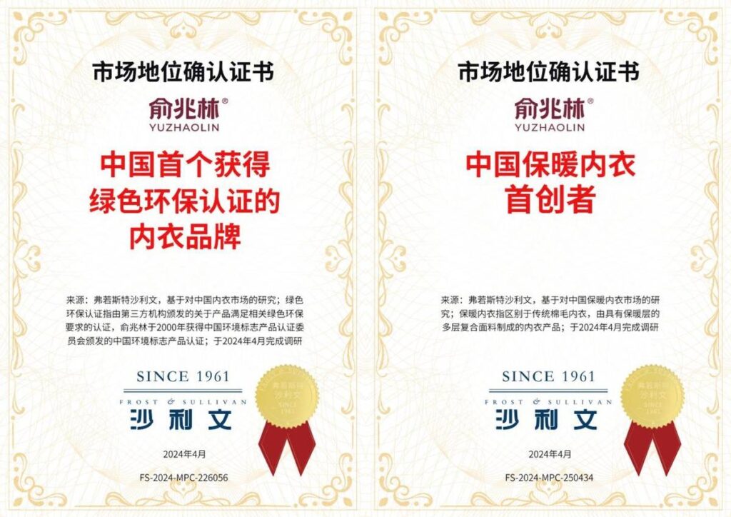 2024年4月,全球性的企业增长咨询公司弗若斯特沙利文经过对中国保暖内衣市场的深入调研,先后向俞兆林颁发两张市场地位确认证书,认定俞兆林为“中国首个获得绿三色环保认证的内衣品牌”“中国保暖内衣首创者”。29年的自主创业之路,俞兆林能一步步成为国民品牌,就是因为一直严格贯彻着自主研发,严选制造、严格品控的经营生产理念,聆听消费者需求,坚持洞察社会情绪、紧抓用户需求,以贴近生活、走近用户的方式代替宏大叙事说教,策划以用户为中心、以美好生活需要为中心的营销事件,以线上线下整合的多样媒体放大内容种草力,让品牌和产品最大化破圈。