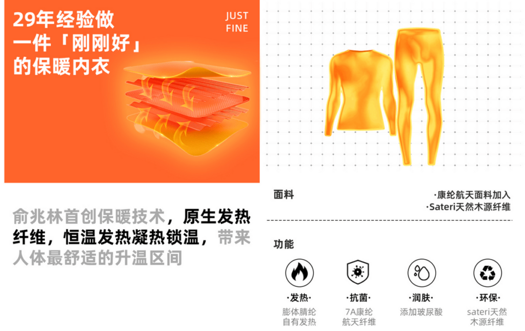 俞兆林的新品御风保暖衣的材质由47.6%再生纤维素纤维、41.5%腈纶、10.9%氨纶组成。膨体腈纶拥有三层结构,蓄热锁温,能自有发热。7A康纶航天纤维抑菌黑科技,能够实现物理抗菌,具备远红外发热以及防臭功能,水洗150次后仍能有效抑菌。产品还采用Sateri天然木源纤维,来自权威认证负责任管理的种植林,100%可再生、可降解、纯净自然、零石油基材料添加,高级别环保标准、赋予丝般触感。玻尿酸的添加,也让御风保暖衣可以具有润肤保湿功效。同时,产品以双面抓剪烫工艺制作完成,帮助体感温度升温。据调查,在保暖衣行业内,普通织物为达到柔软顺滑感,通常添加涤纶成分,也是面料表上常见的聚酯纤维(俗称涤纶),这也是其他多家厂商的主流方案。但是聚酯纤维不透气且不吸水,导致普通织物虽然手感不错,但贴身穿容易闷汗不透气。
