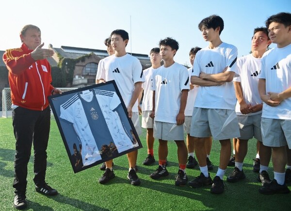 当日,古尔登先生一行来到清华大学西体育场,与清华大学男子足球队队员进行互动。作为一名前职业足球运动员,古尔登与队员现场踢起了足球,气氛非常热烈。古尔登认为:”足球是阿迪达斯的基因,我们期待足球成为桥梁,助力清华足球队员拓展全球视野,在未来展开更多跨文化的、深层次的交流。”清华大学授予古尔登先生”清华大学足球队名誉教练“称号。