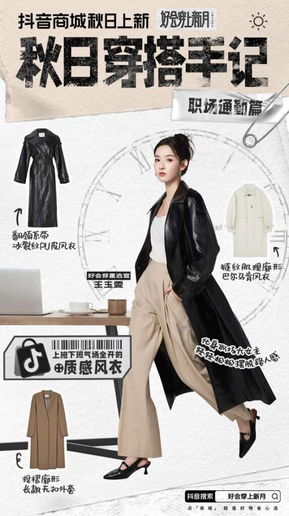 具体来说,抖音商城联合张突然、黑犬酱、陈采尼、林小宅、余三火等 6 位不同领域的嘉宾,通过平面展示+vlog 的形式,生动演绎六大秋季流行趋势。在设计师陈采尼眼中,融合低调淡雅的低饱和配色、叠加经久不衰的老钱风穿搭,是「高智淡人风」的精髓。兼具时尚感和实用性的服饰,是穿搭博主余三火「城市机能风」的一部分;演员林小宅融合颜色冲突、单品叠穿、材质碰撞,将意想不到的单品组合在一起,演绎出「失序混搭风」的有趣……缤纷的时尚观点,唤醒了用户对皮草、衬衫、冲锋衣、夹克、牛仔裤、新中式短外套等核心品类的关注。