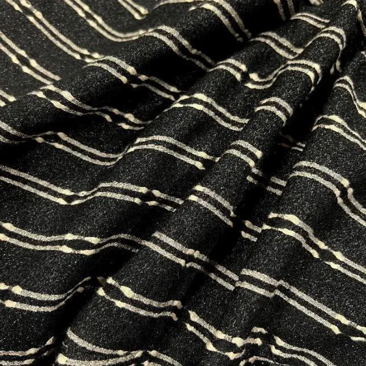 涤棉羊毛成分加入了高光亮丝材质,竹节纹样演变,金典质感的黑色和米白色配色,且有立体和空间质感,加入亮丝材质更显时尚潮流之感。