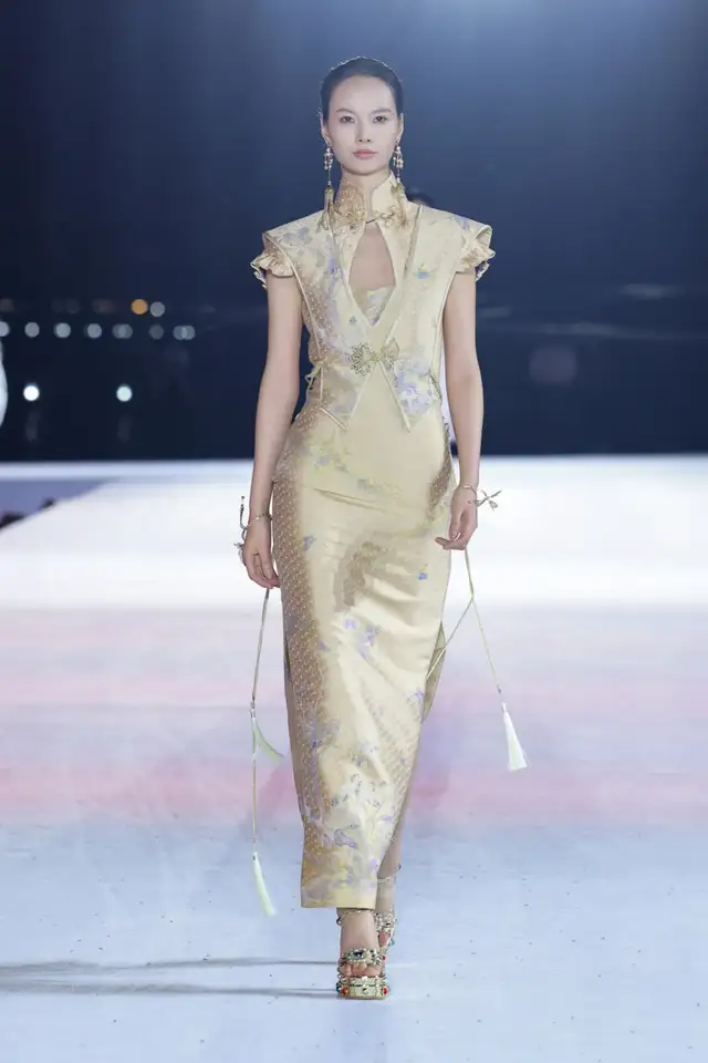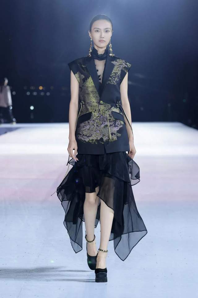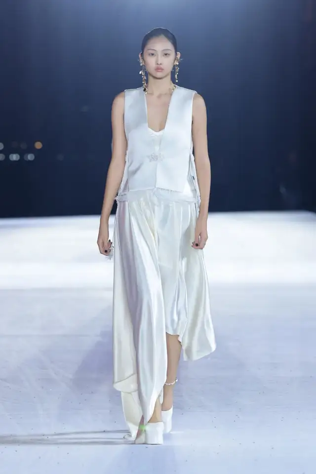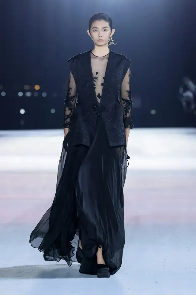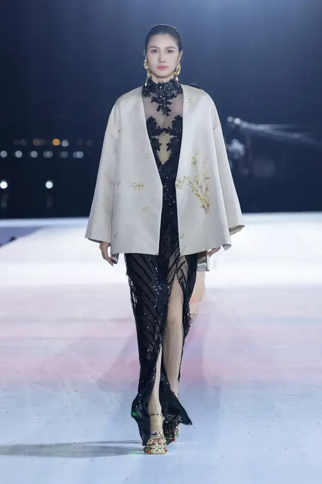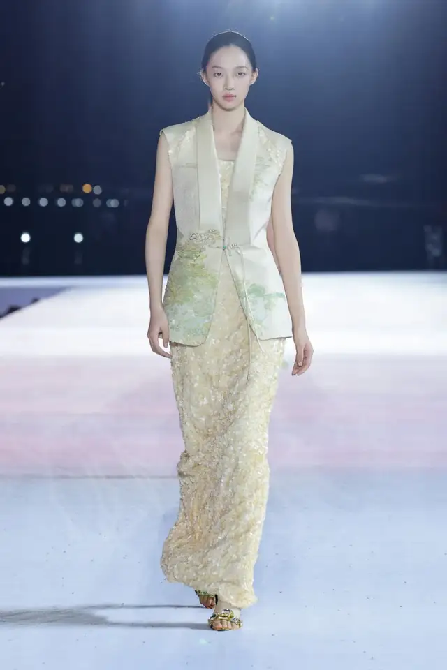 设计师以昆剧马甲为基本廓形,融合了如意纹样的吉祥寓意以及中国结的精致工艺,使用西式剪裁呈现东方廓形,打造出了中西相益的样貌。仿螺钿纱线刺绣作为本季的重点刺绣工艺,在交叠中融合,营造出流光溢彩的东方风情。
