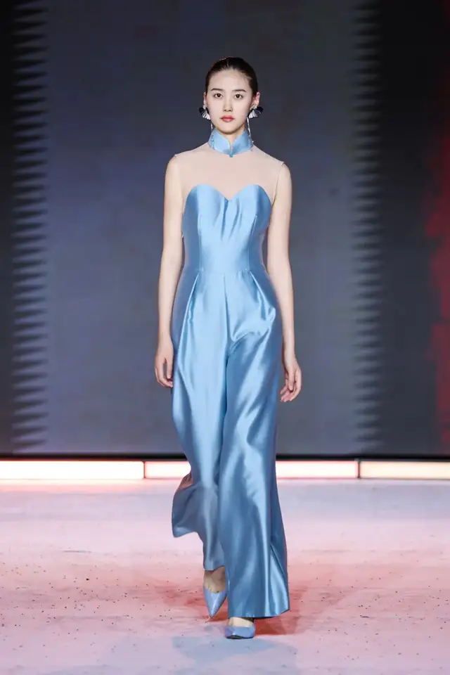 设计师熟练运用旗袍制作工艺之镶、嵌、滚、绱,巧妙地将旗袍边缘的大面积布料拼接装饰,增强旗袍的美观性和耐用性,在缝份中加入装饰条,以增加旗袍的层次感和视觉效果,将布料边缘包边,用于保护旗袍的边缘并增加美观,将盘扣等配件缝制在旗袍上,以确保旗袍的整体美观和实用性。