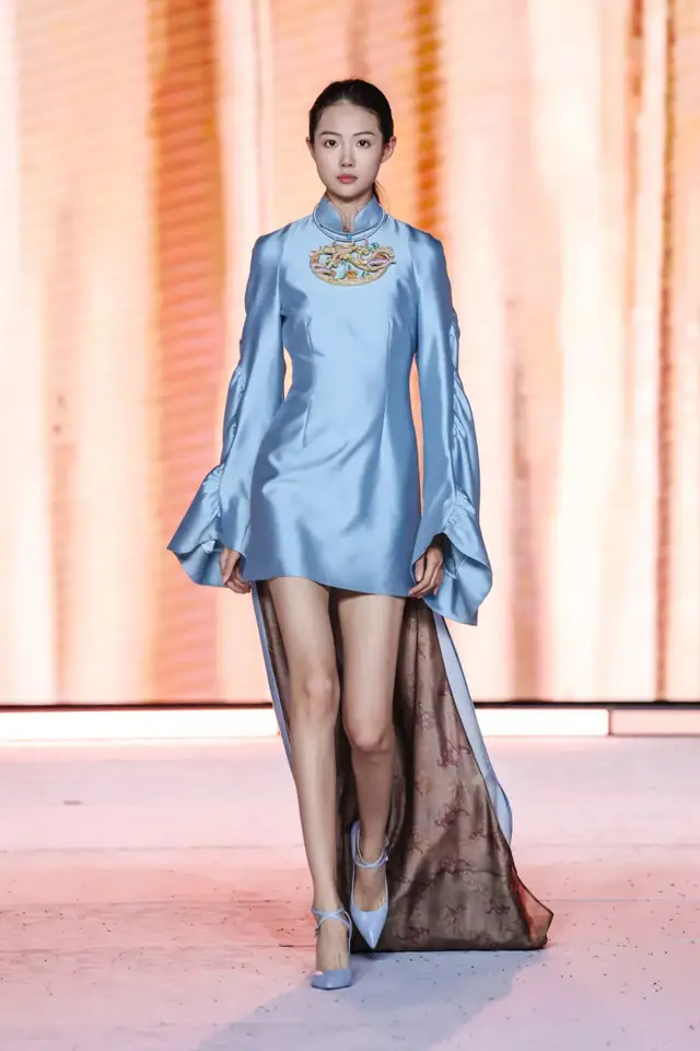 在服饰细节上,设计师大量使用花扣、盘扣传统技艺,制作非常讲究。制作盘扣时,需要先将扣条嵌入铜丝,然后通过精细的编织和弯曲,形成各种精美的图案。这一工艺不仅需要高超的手工技巧,还需要具备一定的美学理解,以确保盘扣与旗袍的整体风格和谐统一。