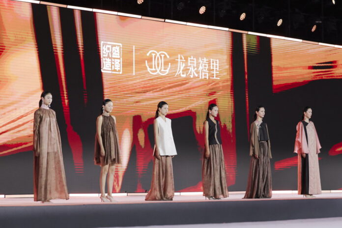 秀后采访中,龙泉禧里品牌创始人黄秋停讲述了绸都盛泽的丝绸文化及其品牌化发展,描述了龙泉禧里品牌的含义及其设计理念,强调了品牌在中国传统文化中的传承和创新。他表示,本次苏州湾时尚趋势的发布也是龙泉禧里品牌重新出发的一个新开始。