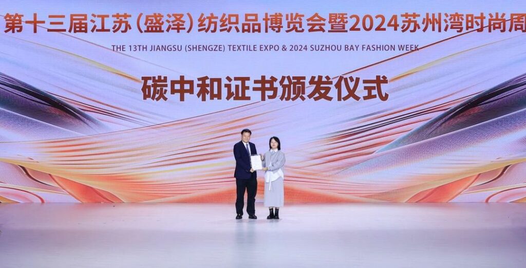 现场,盛泽获颁第十三届江苏(盛泽)纺织品博览会暨2024苏州湾时尚周碳中和证书,该镇将以实际行动拉开纺织产业集群绿色低碳转型的序幕,彰显出千年绸都的责任感与使命感。