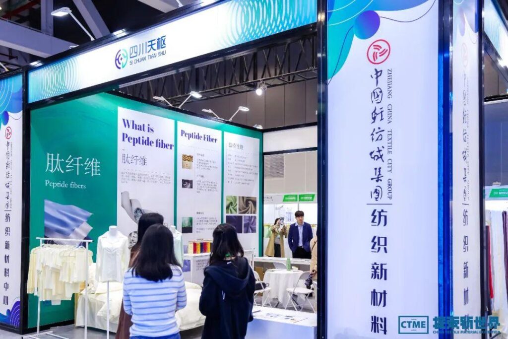 中国轻纺城集团纺织新材料中心携手兴发集团、三联新材料、四川天枢等十余家优秀的新材料企业,在此板块共同亮相。兴发集团凭借其自主研发的发热、抗菌、排汗、晾干等功能性涤纶长丝原材料,展示了纺织新材料领域的最新成果及开发潜力。泰鼎科技的石墨烯羊毛面料备受瞩目,除了具备常规功能外,还自带远红外、吸湿排汗、消臭抗菌等多种功能,斩获30万米的订单。四川天枢与四川大学叶光斗教授共同研发20余年的肽纤维产品在本次展会上首次亮相,受到现场采购商的青睐,收获超30家意向客户,肽纤维是生物基人造蛋白质纤维,富含18种氨基酸。