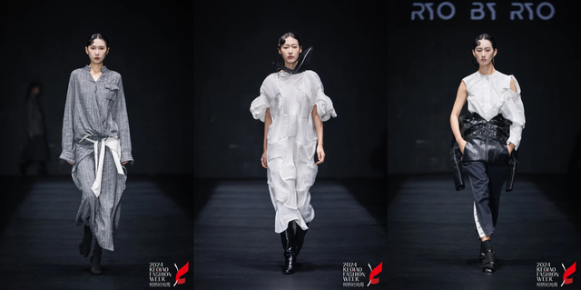 “逍遥几何” RYO BY RYO品牌2025A/W发布会上,绍兴且听蝉鸣品牌管理有限公司的秀演服饰呈现了几何图形与实用主义的结合,几何剪裁包裹衣身是本季产品最大的风格突破。在面料与工艺特点上,顶级双面羊绒、轻便运动装面料、水洗牛仔、皮衣的组合应用,使得系列服装成为了秋冬服饰中的亮眼之作。
