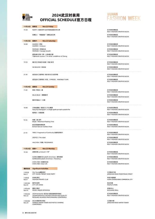 11月中下旬,还将举办模特大面试、汉口水塔美学分享会等系列定制化时尚活动,推动武汉时装周成为“商业发展助推器”。