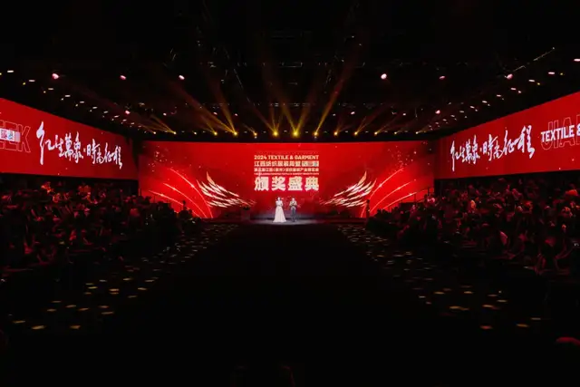 11月19日,2024江西纺织服装周暨第五届中国(赣州)纺织服装产业博览会颁奖盛典在中国·赣州(于都)国际会展中心秀场举行。江西省工信厅二级巡视员杨金娥,赣州市人民政府副市长连天浪,省工信厅纺织工业处处长潜九庆,赣州市人民政府副秘书长钟福林,赣州市市场监管局局长、市纺织服装产业链推进协调小组副组长兼办公室主任黄蕙,于都县委副书记、于都县长李松柏,李高华、王峰、罗高波、赖晓强等在家的县四套班子领导及各行业代表出席典礼。杨金娥、连天浪分别致辞,李松柏作了答谢词。