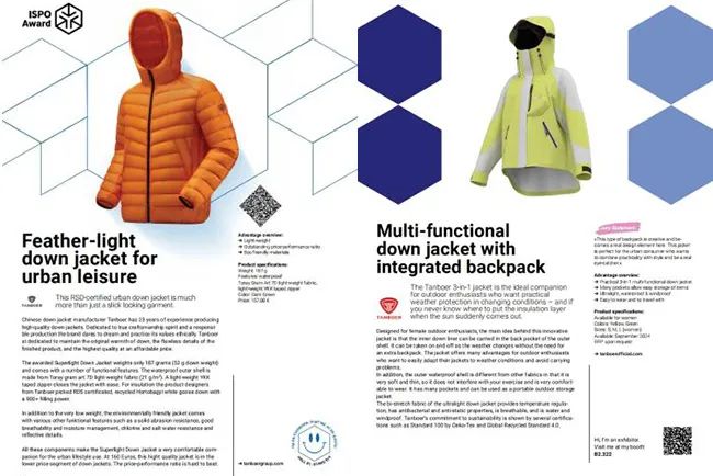 坦博尔于2022年首度受邀参加ISPO展,与全球50个国家的优秀品牌同台,展示中国智造的品质和魅力;次年品牌二度受邀亮相慕尼黑,以专业高品质产品荣获ISPO年度大奖;此番,连续第三年受邀参展,坦博尔更是一举囊括多个奖项,其中含金量满满的年度面料TOP10、ISPO 2024年度大奖 ,表明坦博尔经历25年历史沉淀,已成长为深耕国内市场并兼具国际拓展优势的专业户外品牌。
