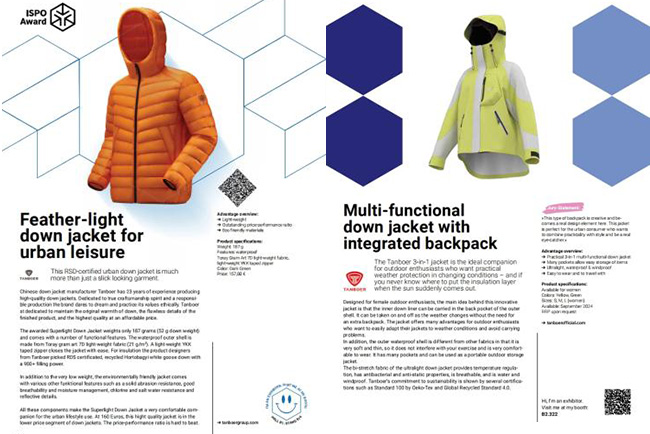 坦博尔于2022年首度受邀参加ISPO展,与全球50个国家的优秀品牌同台,展示中国智造的品质和魅力;次年品牌二度受邀亮相慕尼黑,以专业高品质产品荣获ISPO年度大奖;此番,连续第三年受邀参展,坦博尔更是一举囊括多个奖项,其中含金量满满的年度面料TOP10、ISPO 2024年度大奖 ,表明坦博尔经历25年历史沉淀,已成长为深耕国内市场并兼具国际拓展优势的专业户外品牌。