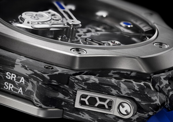 全新时计在保留原有44毫米直径及13.75毫米厚度设计的同时,其标志性的Big Bang系列表壳及机芯均采用灰色蜂巢饰面。表圈则配以双色饰面——顶部经过缎面抛光处理,而侧面则以闪耀微珠喷砂工艺润饰。指针与时标以深浅不一的两种蓝色进行点缀,而表冠侧面则同样饰有浅蓝色装饰。腕表的3点钟及9点钟位置侧面,与表圈及表耳处均由灰色磨砂碳纤维材质打造而成,并配备蓝宝石表镜。与此前发布的两款腕表一致,全新Big Bang SR_A by Samuel Ross陀飞轮碳纤维腕表依旧搭载表厂自制HUB6035机芯。该机芯由264个组件构成,配备自动上链微型摆陀,并于6点钟位置呈现醒目的镂空陀飞轮装置,可为腕表提供72小时动力储存。腕表所配备的柔韧橡胶表带与深蓝色分秒针采用同色设计,并饰以与表壳相同的蜂巢晶格图案,其表扣也经过重新设计。