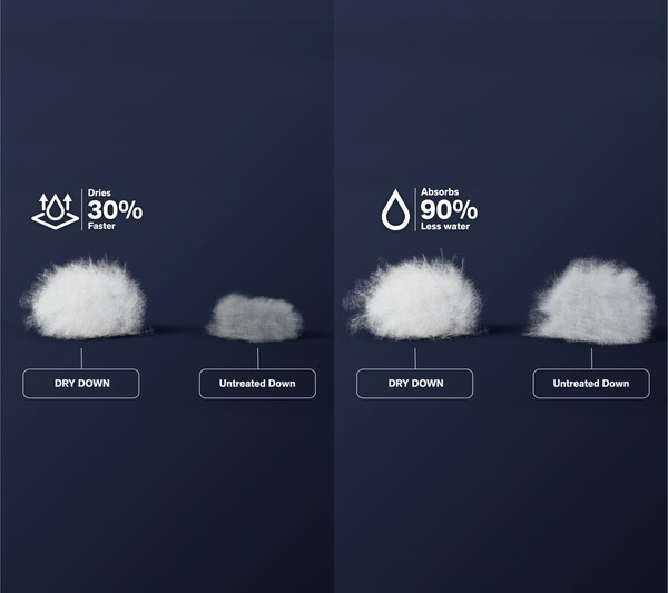 DRY DOWN采用Nikwax拒水处理技术,使羽绒服在遇水后吸水性降低约90%,干燥速度提高约30%,显著提升速干性能,同时保持羽绒服的轻盈与卓越保温性能。这一创新科技解决了潮湿环境下羽绒服保暖性能下降的问题,让户外玩家在湿冷环境中也能感受到持续的温暖与舒适。