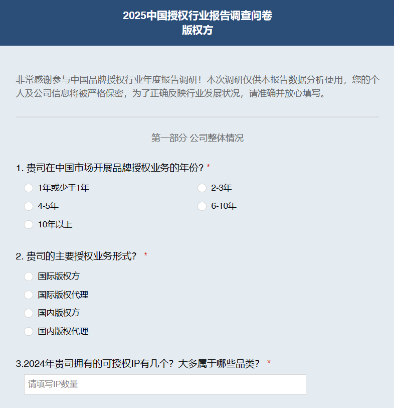 您提交调研问卷有多认真,我们发布的授权行业报告就有多精准。让我们共同携手,为授权行业发展交上完美答卷!