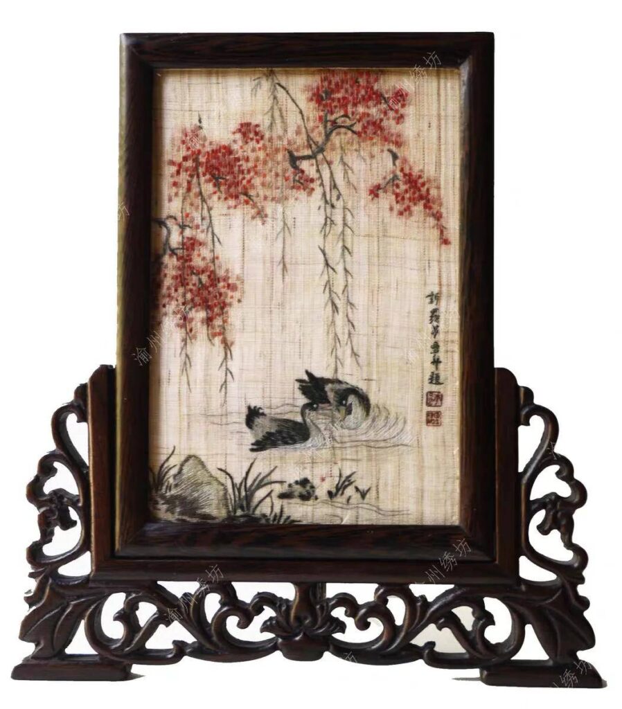 02 夏布绣台屏《春江水暖》