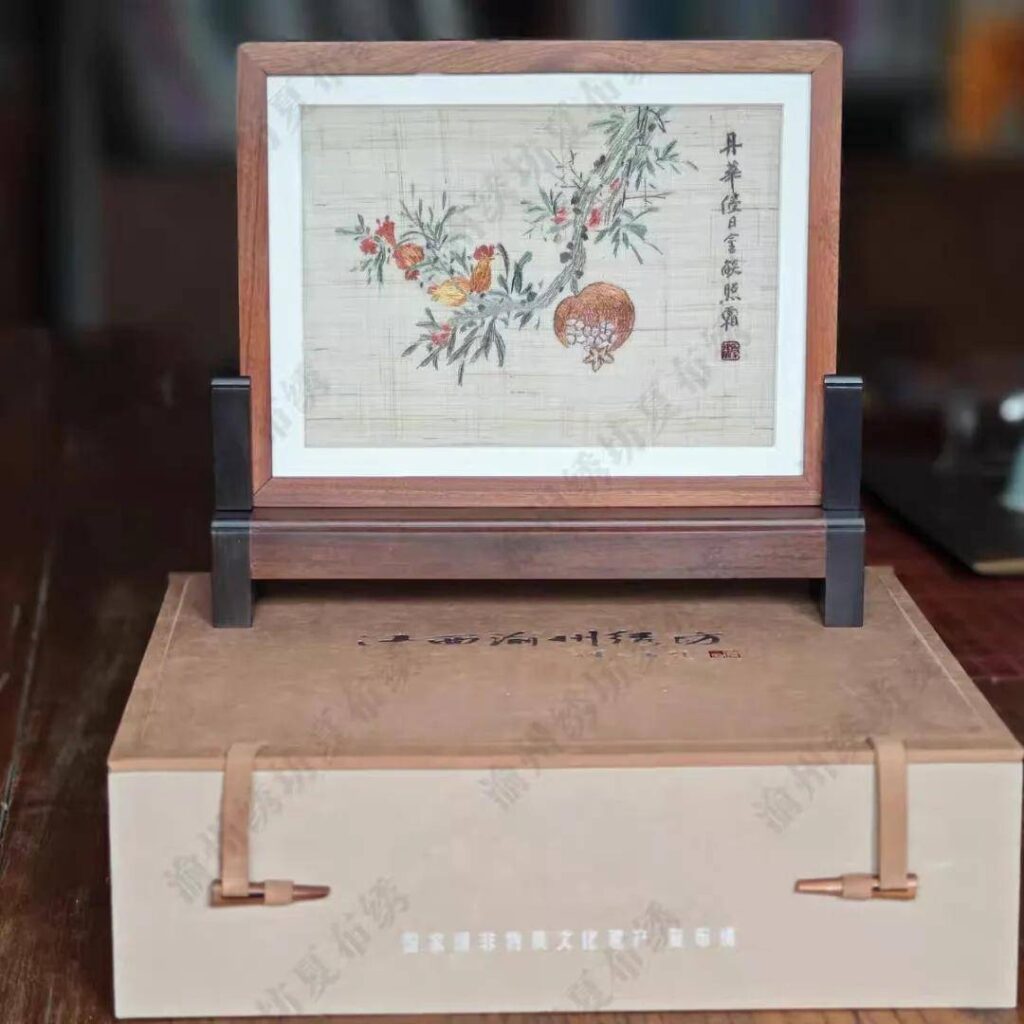 夏布绣音乐台屏《石榴》将传统手工刺绣与现代音乐艺术完美融合,以国家非物质文化遗产夏布绣技艺展现精湛的匠心。台屏以天然苎麻布为材质,绣制生动的石榴图案,象征着丰收与多福,寓意着家庭的和谐与幸福。
